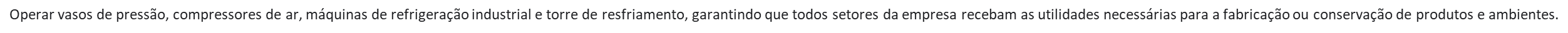 - Operar máquinas de refrigeração industrial, acionando as bombas de condensação e de água gelada, observando pressão, temperatura de saída e retorno de água gelada, informando o superior imediato quando detectadas irregularidades;